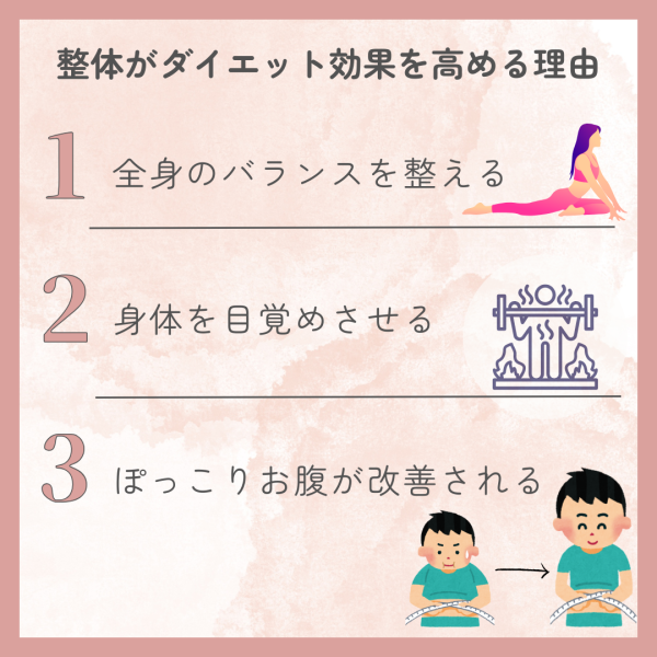 整体を受けることで、ダイエット効果につながると言われています。その理由をいくつか紹介します!