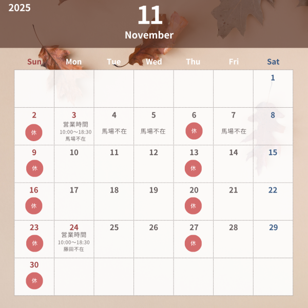こんにちは!KINMAQ整体院 南福岡院です。11月の営業日のご案内です木・日以外は休まず営業しております!